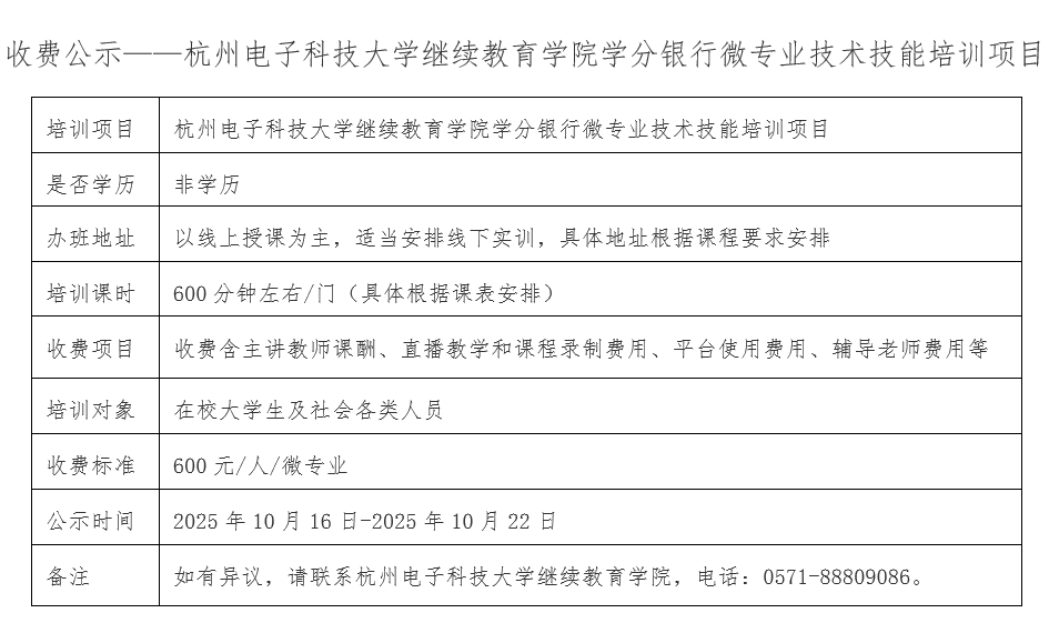 收费公示-杭州电子科技大学继续教育学院学分银行微专业技术技能培训项目