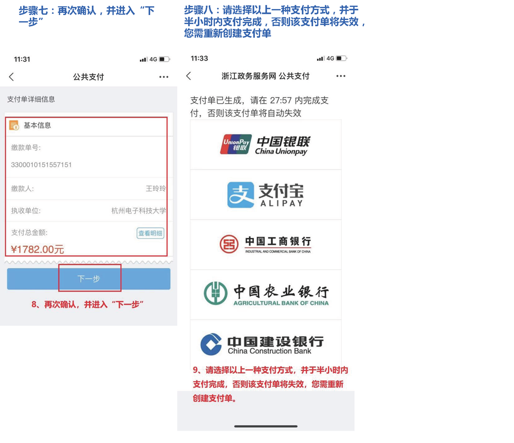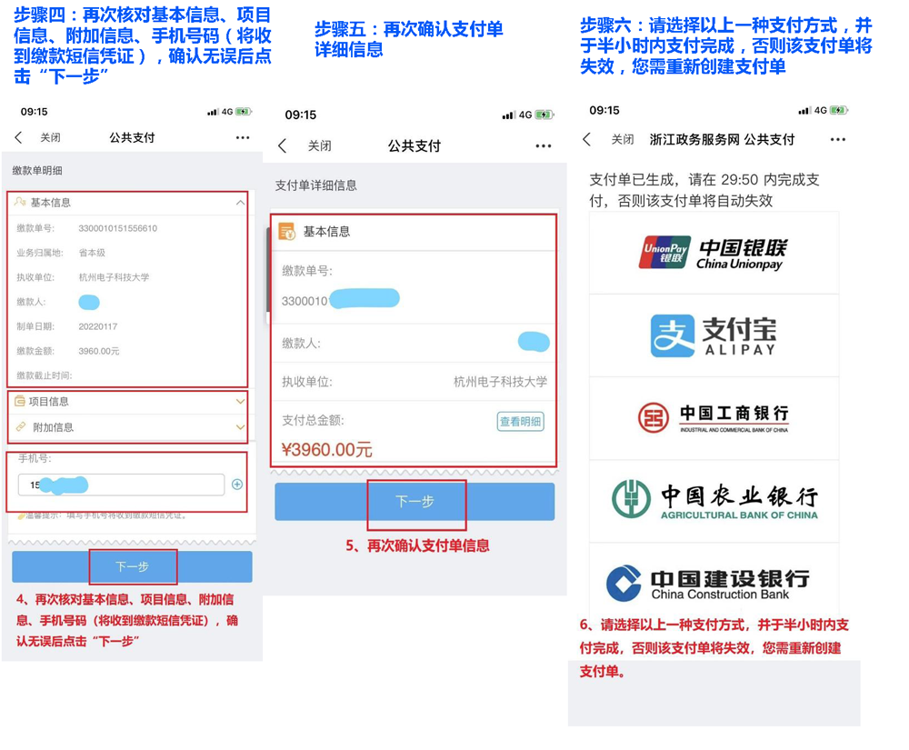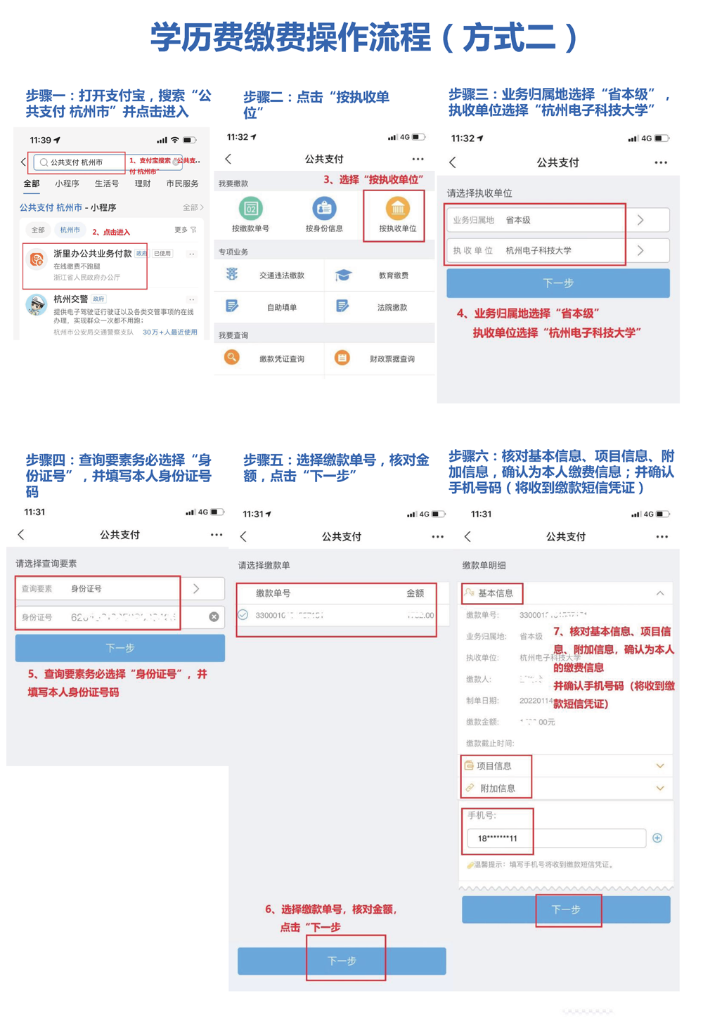 方式二:打开手机支付宝app进入主界面→搜索“公共支付 杭州市”→进入“浙里办公共业务付款”→点击“按执收单位”→业务归属地选择“省本级”,执收单位选择“杭州电子科技大学”→查询要素务必选择“身份证号”,并填写本人身份证号码→选择缴款单号,核对金额→核对基本信息、项目信息、附加信息,手机号码(将收到缴款短信凭证),确认为本人缴费信息→再次确认支付单信息→支付。