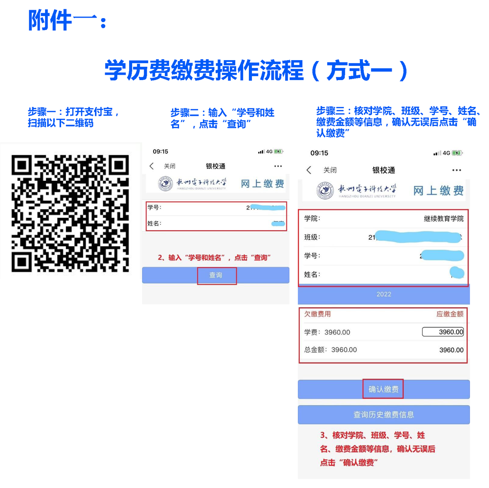 方式一:扫码缴费。打开手机支付宝app进入主界面→扫描以下支付宝缴费二维码→输入学号、姓名→查询→核对学院、班级、学号、姓名、缴费金额等信息→确认缴费→再次核对基本信息、项目信息、附加信息,手机号码(将收到缴款短信凭证),确认为本人缴费信息→再次确认支付单信息→支付。
