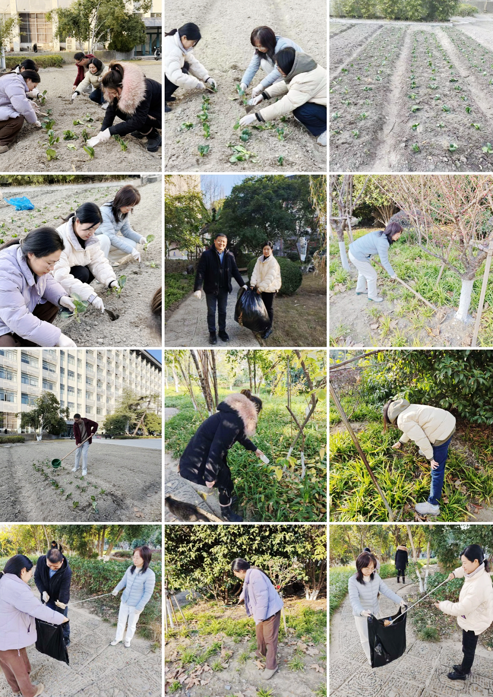 1月9日下午,冬日的暖阳洒满文一校区校园中央花圃基地,继续教育学院教工第一党支部与后勤文一党支部的党员们手持小铲刀、水壶等工具,共同开展了一场别开生面的劳动实践主题党日活动。活动现场,党员们分工协作,翻土、挖坑、扶苗、培土、浇水,动作娴熟而有序。青菜苗在党员们的巧手下挺立成行,嫩绿的叶片在寒风中轻轻摇曳,为冬日的校园增添了一抹生机勃勃的翠色。